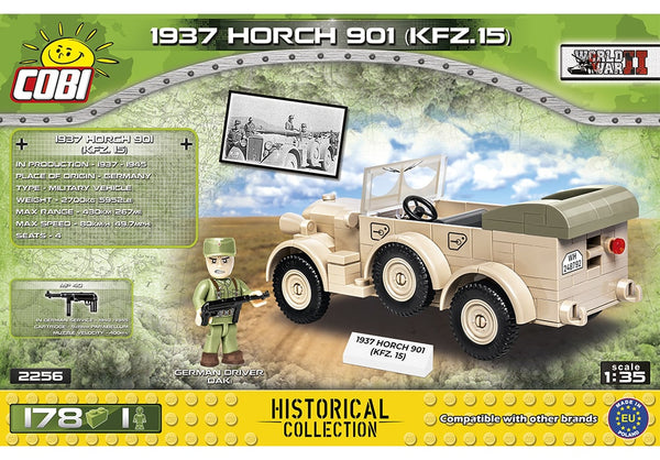 1937 Horch 901 (KFZ.15) dienstwagenCOBI World War 2 Historical Collection (Afrika Korps) Beschrijving De Duitse Horch 901 (KFZ.15) wagen werd geproduceerd in 1937. Specificaties Aantal onderdelen: 178 Compatibel met andere toonaangevende merken bouwblokken, zoals...
